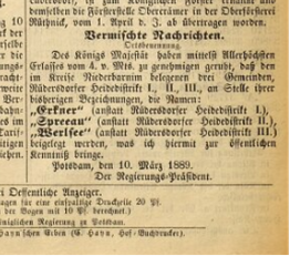 Vorher wurden die aus den Ortsteilen Freienbrink, Sieverslake, Storkowfurt, Störitz sowie Alt- und Neu – Mönchwinkel bestehende Siedlungen als Heidedistrikt II von der königlichen Domäne Alt – Rüdersdorf verwaltet. (Quelle: Regierungsbezirk Potsdam: Amtsblatt der Regierung in Potsdam. 1889, https://www.digitale-sammlungen.de)